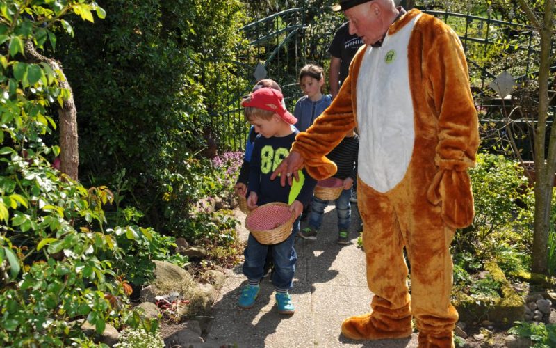 Osterhase Gerd Grieme „hoppelte“ mit den Kindern durch den Garten und suchte die Nester mit den Natureiern und süßen Leckereien ab.