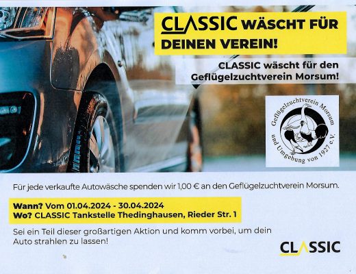 Vom 1. bis 30. April wäscht die Classic Tankstelle in Thedinghausen für den Geflügelzuchtverein Morsum Für jede verkaufte Autowäsche bekommt die Jugendgruppe/Zeltlagergruppe einen Euro. Wir […] Read More